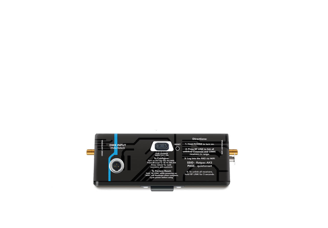 Imagine controlling lighting levels from your iPhone or tablet! Whether from your DIT tent, follow car, or right on set, the AKS Plus gives you full control. Small enough to fit in your hand, powerful enough to run your lights through a wireless transmitter and an Art-Net DMX node: An all in one unit powered by over 20 hours of battery life! Simply turn on the AKS Plus, choose RatPac AKS in your device’s WiFi settings, turn on your DMX app and you’re ready to go! Compatible with all wireless RatPac products and CRMX compatible devices.